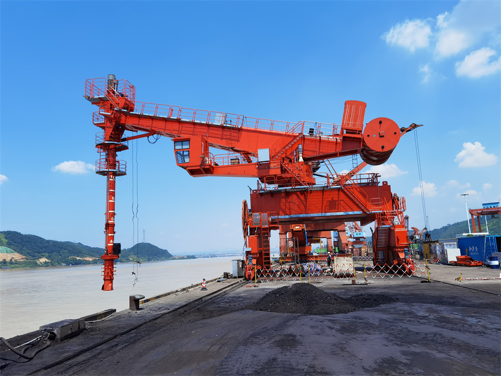 螺旋式卸船機屬于連續(xù)卸船機,由以下部分所組成:沿順岸軌道移動的門架及行走小車;支承在門架上并繞中心旋轉的平臺;由變幅油缸驅動可上下俯仰的水平伸臂及固定其上的水平螺旋輸送機;由擺動油缸驅動可繞水平伸臂端部前后擺動的豎直臂及固接其上的垂直螺旋輸送機;安裝在垂直螺旋下端的松料螺旋及取料裝置;位于門架上旋轉塔架下方的水平螺旋輸送機;碼頭后方帶式輸送機等。